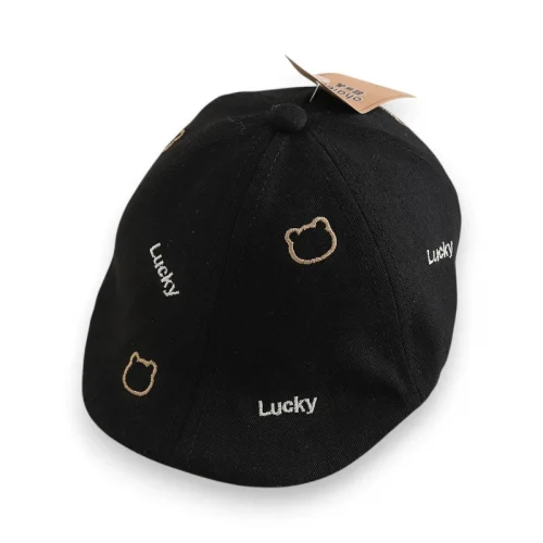• Họa tiết thêu tinh tế: Những biểu tượng mặt gấu nhỏ xinh đan xen cùng dòng chữ “Lucky” được thêu sắc nét trên nếp mũ.